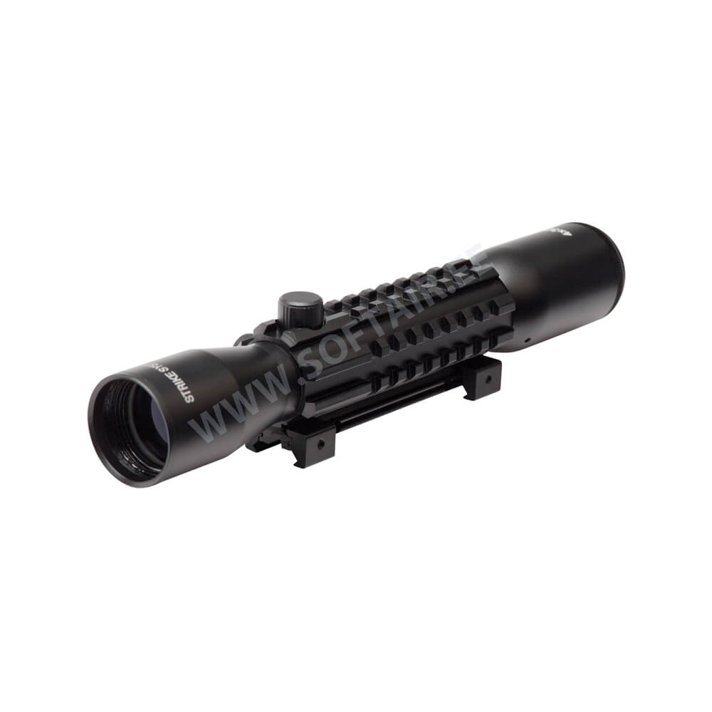 A Tactical scope with 4×32 magnification. It features 21mm rails on all 3 sides, allowing mounting of flashlight, laser and a small red-dot sight on top for close-quarters shooting. Integrated Weaver/picatinny mounts. Fully adjustable windage and elevation.