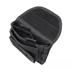 The map pouch has got three pockets, one of them is closed with hook&loop, two other pockets are equipped with elastic bands which are used to segregate and organize the content. The bigger pocket is equipped with a drain hole which allows to remove the water which possibly gathered inside the pouch. From the outside, the panel is equipped with elastic bands located on the sides which allow the attachment of a chemical light, a pen or a flashlight.