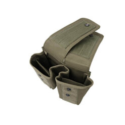 The pouch is made od nylon fiber. The mount is compatible with the MOLLE system’s standard PALS webbing. The pouch holds 2/4 x AK type magazines, 4/6 x M4/M16 magazines (STANAG) or 2 x G36 magazines and is also equipped with an additional inner divider. The dimensions of a single pouch is as follows: 160x70x65mm. The flaps are closed with the use of hooks&loops and fasteners. Color: olive (it looks lighter in the picture)