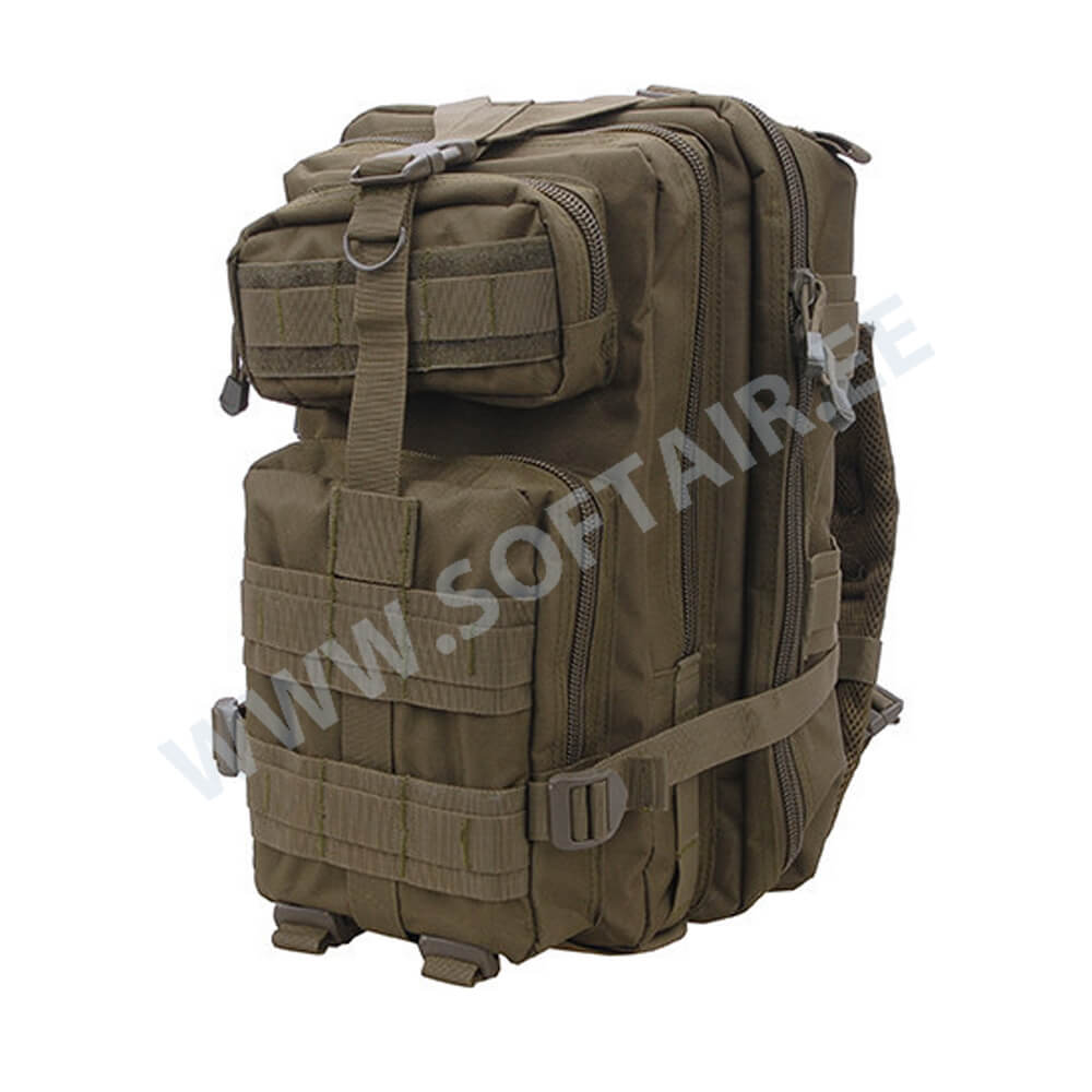 A very comfortable nylon made Assault Pack. Thanks to the good planning of the compartment and pocket placing the backpack is very capacious despite the rather small dimensions. The suspenders are adjustable in two ways: on the height of the shoulder and by the bottom of the backpack. The backpack can be taken off in a very easy and fast way thanks to the buckles located on the end of the suspenders.