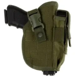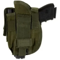 Pistol belt holster with mag pouch. This holster can quickly be changed for either left or right handed players. Retention strap with push button snaps open for a fast draw. A additional safety strap keeps the gun securely in the holster during the most rigorous activities.