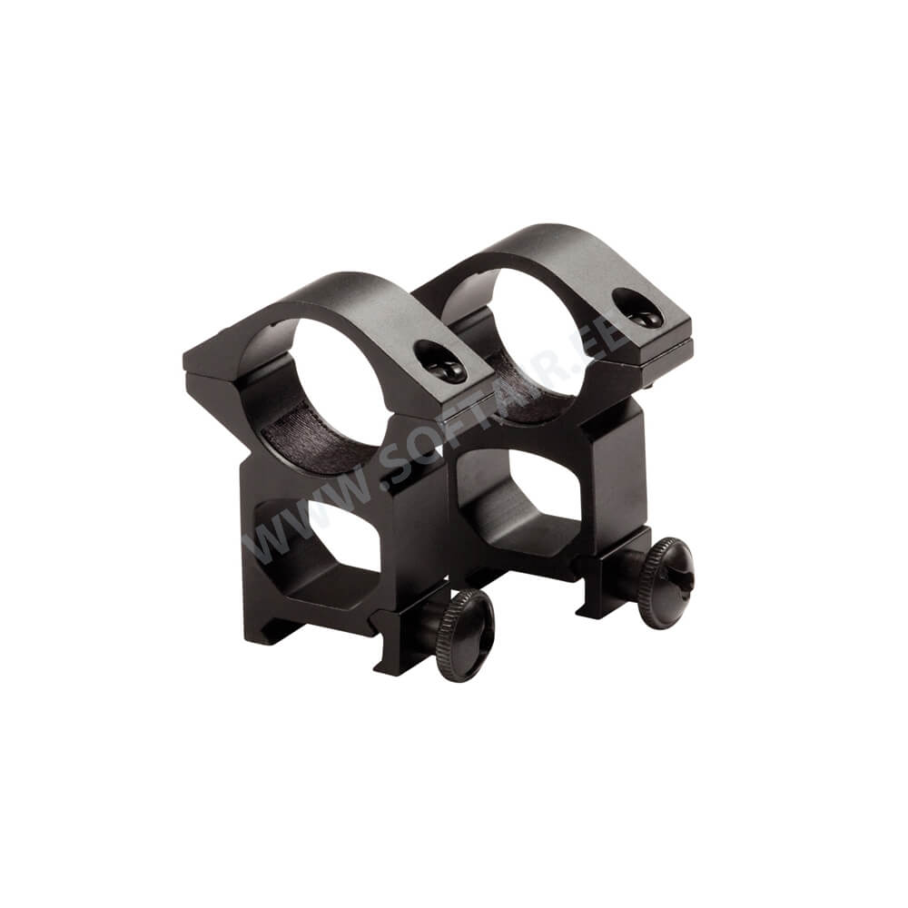 Set of 2 high rings, keeps the scope high on the airsoft gun. Suitable for scopes with large diameter front-lenses. Allows the use of the fixed sights, when using a smaller diameter scope.