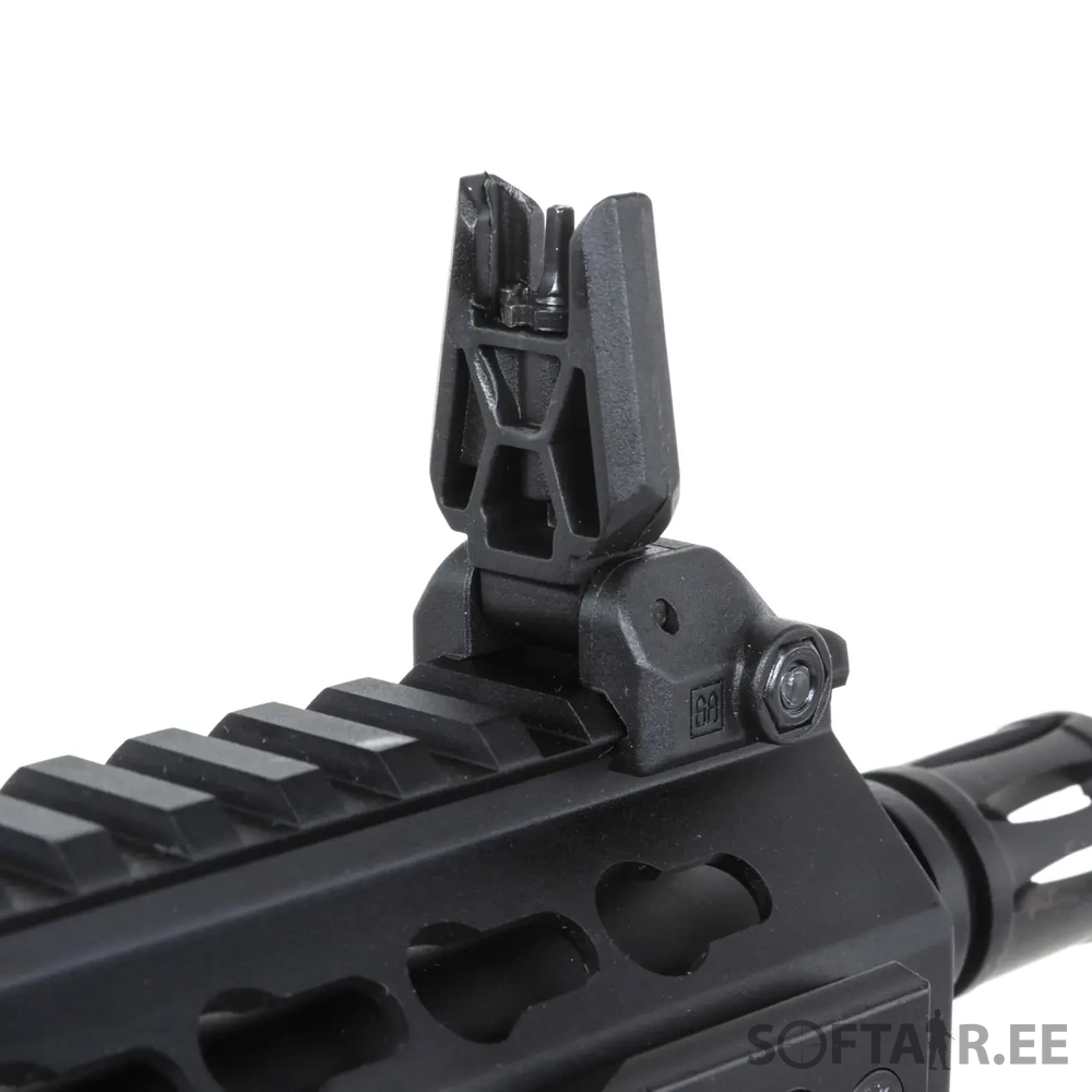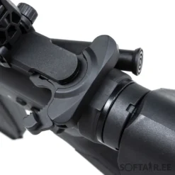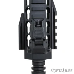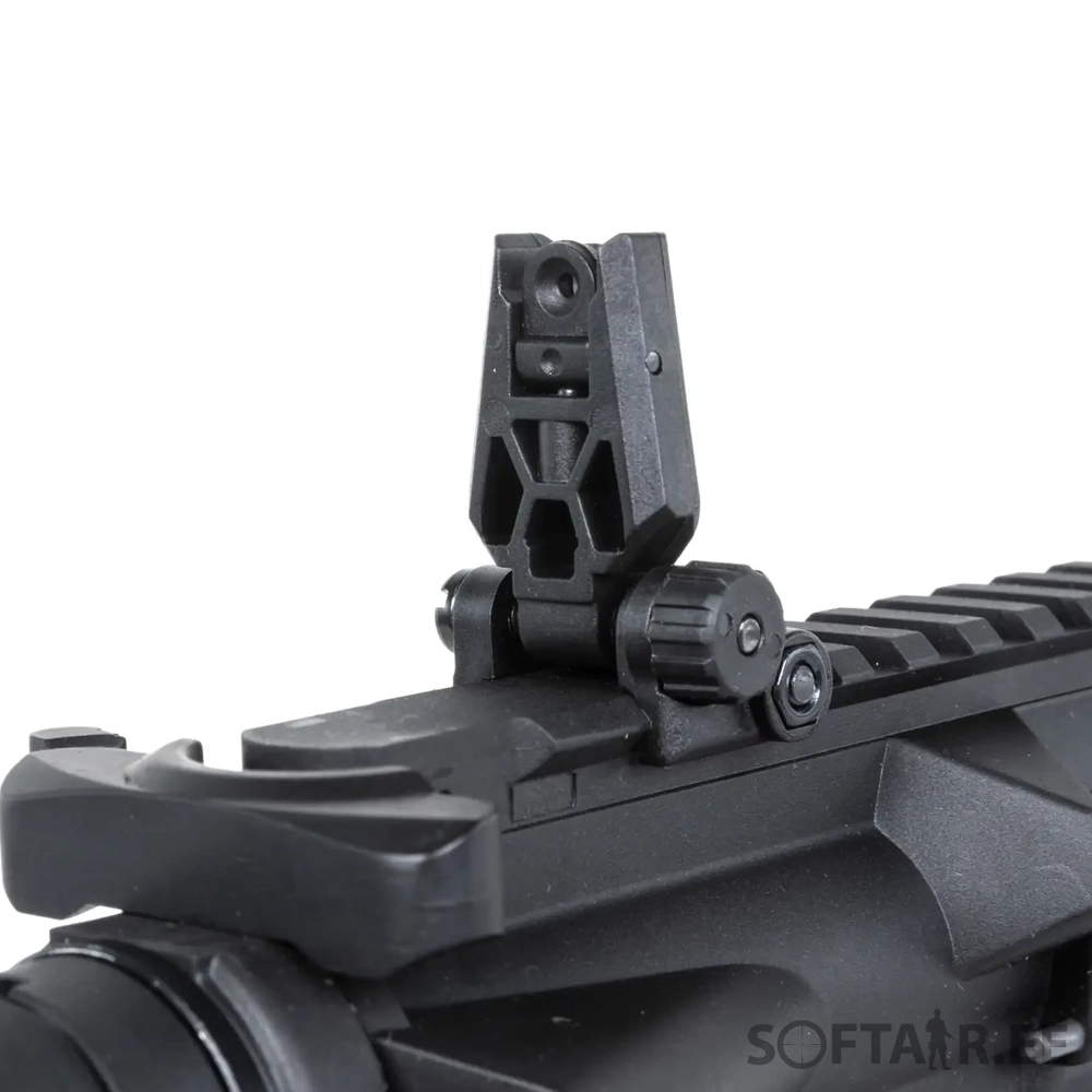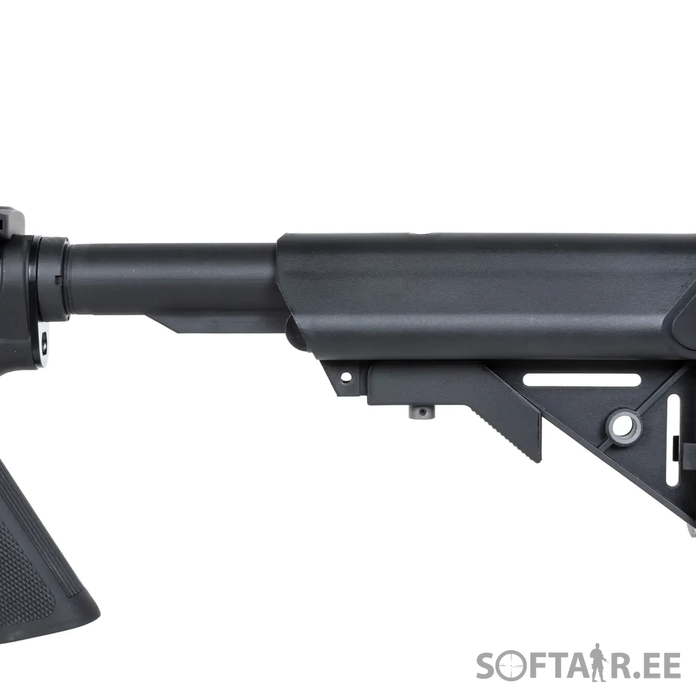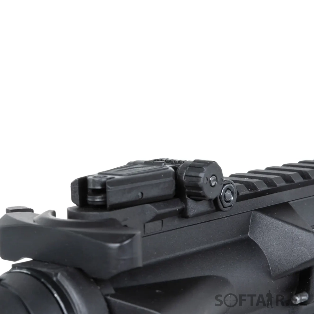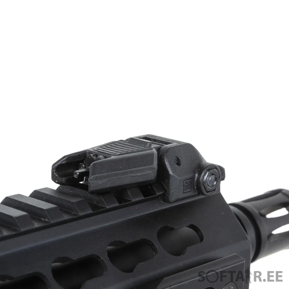 The replica is equipped with a front M-LOK rail, manufactured under license from Strike Industries. The replica also comes with the latest M-Lok angle grip designed by Specna Arms. A folding sight has been fitted to the upper RIS rail, which does not interfere with optoelectronic sighting devices. Thanks to an extendable buttstock finished with a non-slip textured foot, it is possible to adjust the length of the replica to the build and the shooter’s preferences. The standard flame suppressor is mounted on a 14-mm left-hand thread, which makes it possible to attach a sound suppressor in its place.