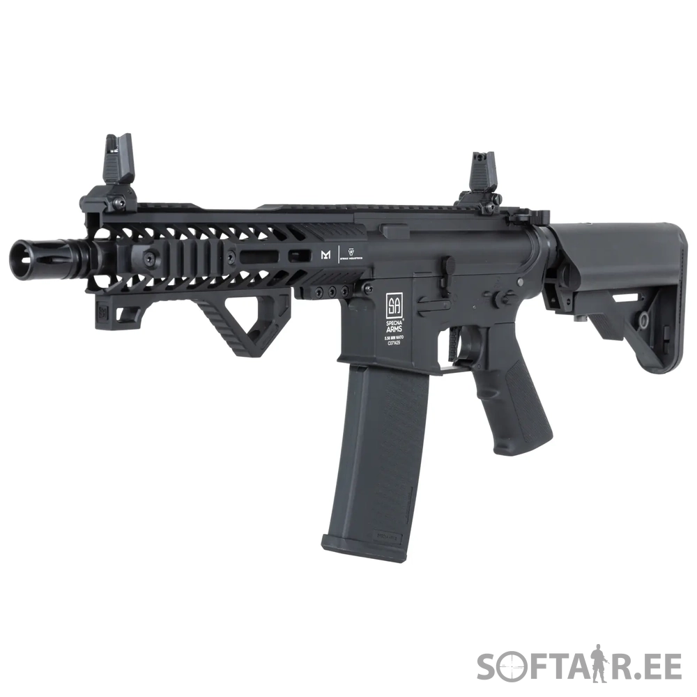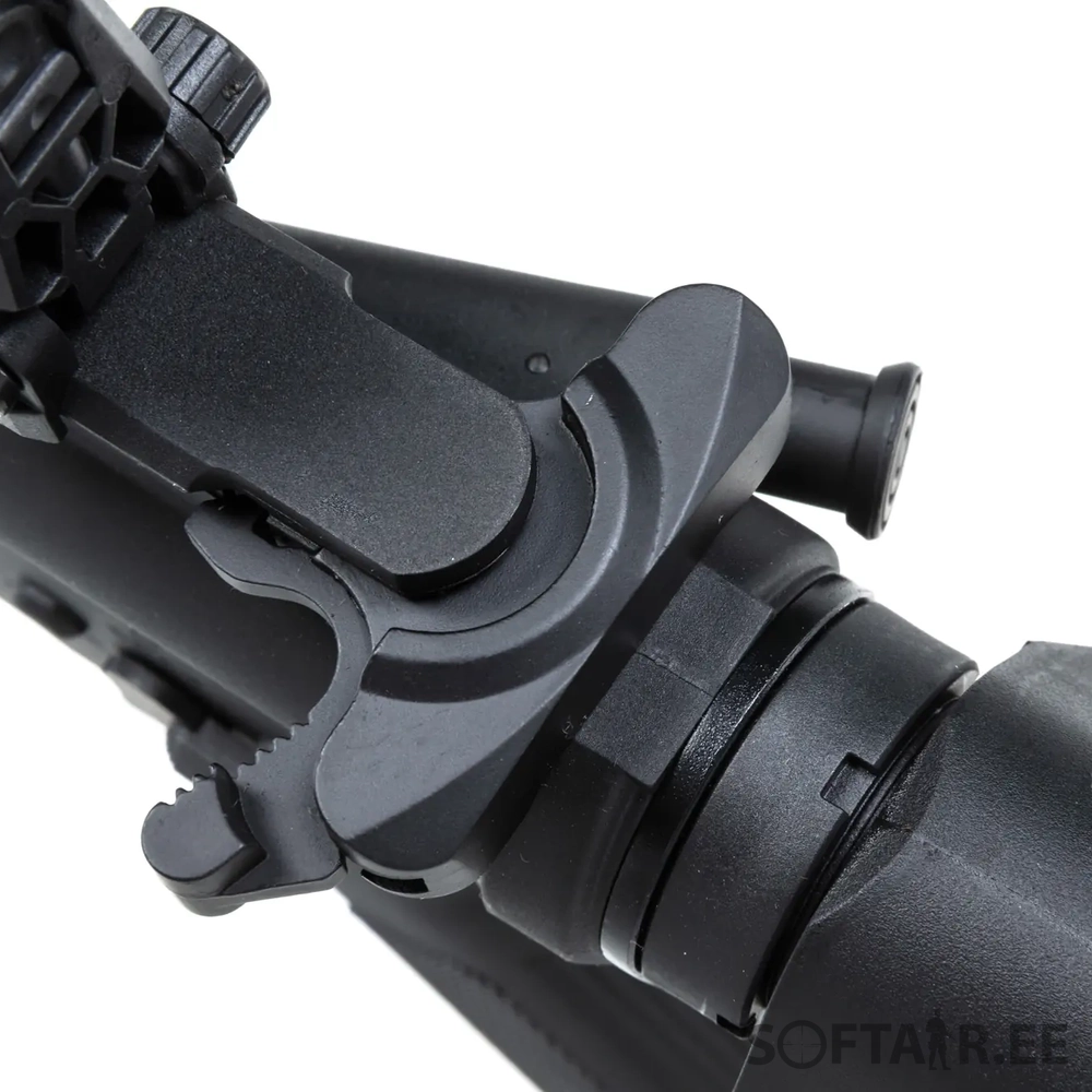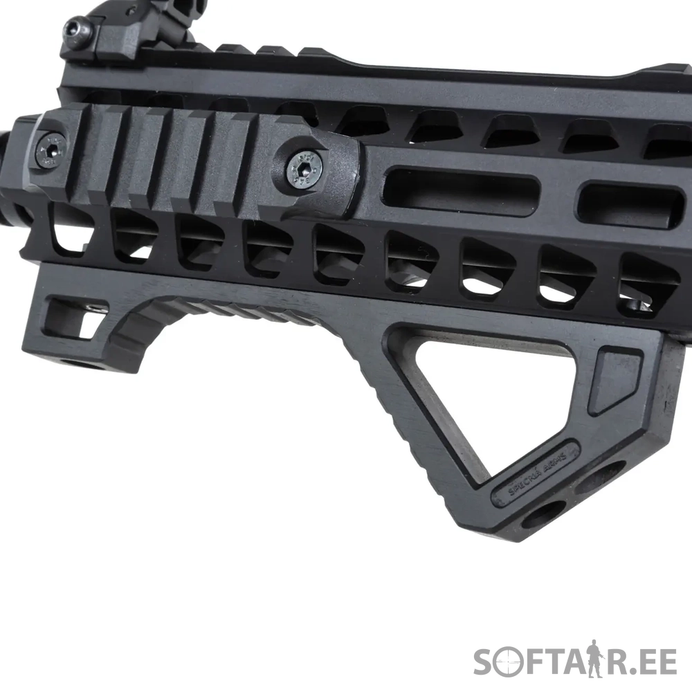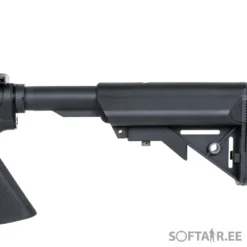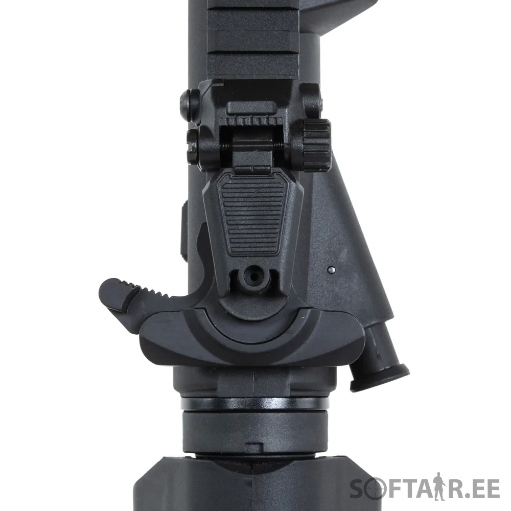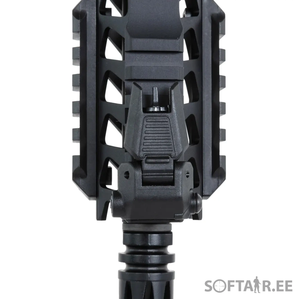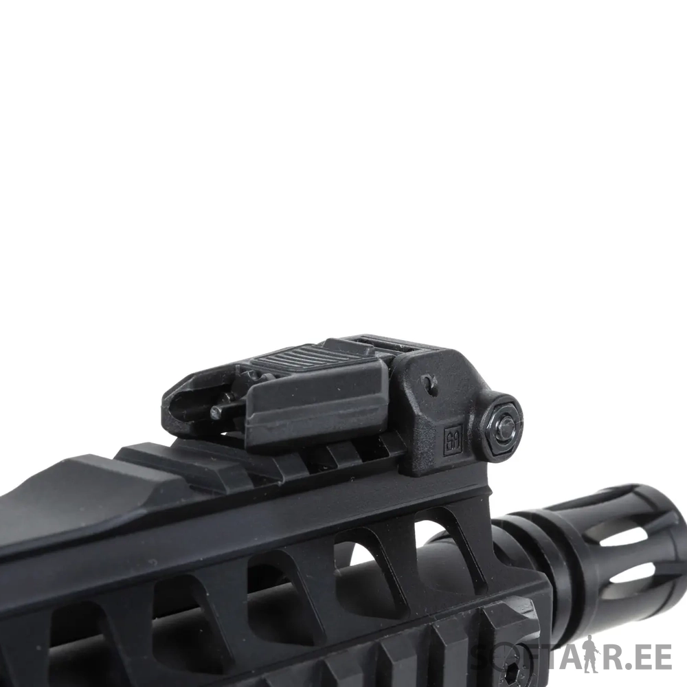 The replica is equipped with a front M-LOK rail, manufactured under license from Strike Industries. The replica also comes with the latest M-Lok angle grip designed by Specna Arms. A folding sight has been fitted to the upper RIS rail, which does not interfere with optoelectronic sighting devices. Thanks to an extendable buttstock finished with a non-slip textured foot, it is possible to adjust the length of the replica to the build and the shooter’s preferences. The standard flame suppressor is mounted on a 14-mm left-hand thread, which makes it possible to attach a sound suppressor in its place.