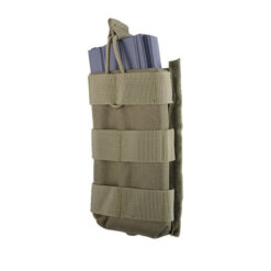 A universal, single, shingle pouch sewn from a durable nylon. The pouch stores a single M4/M16 (STANAG) / AK magazine. The magazine is secured against falling out from the top by an elastic shock-cord. The pouch is compatible with MOLLE webbing system, which means it can be attached to all kinds of vests, belts and backpacks. Color: olive (it looks lighter in the picture)